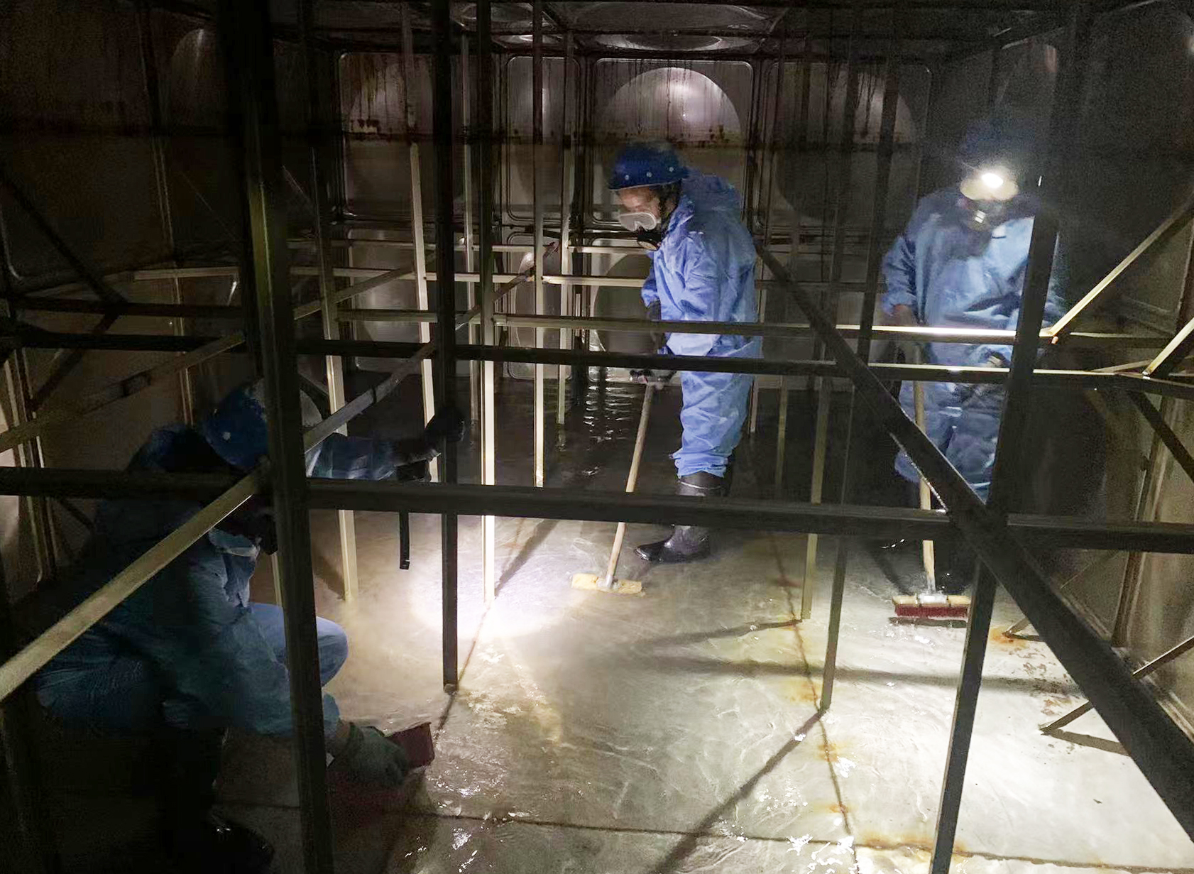 圖:泵房設(shè)備檢修現(xiàn)場 很多人認(rèn)為日常巡檢就是“走一圈”,殊不知,這看似簡單的工作背后,藏著供水人的別樣匠心,供水“鏈條”環(huán)環(huán)相扣,日常巡檢便是其中重要一環(huán)。一次氣管漏氣被漏檢,可能引起隔膜泵運行不穩(wěn)定;一處隱患點被遺漏,可能導(dǎo)致設(shè)備停運;一組濕度數(shù)據(jù)被忽視,可能造成設(shè)備被濕度過高的空氣銹蝕……類似這樣的巡檢細節(jié)不勝枚舉,因此,著眼于細節(jié)是巡檢員們必備的品質(zhì),及時發(fā)現(xiàn)、分析、解決問題,讓每一臺設(shè)備處于良好的運行狀態(tài),便是維修人員最大的底氣。 錯峰作業(yè),密切配合保水質(zhì) 清水池是水廠成品水的儲存水箱,承擔(dān)著調(diào)蓄、穩(wěn)壓、消毒的重要作用,能夠?qū)崿F(xiàn)“高峰多送,低峰多貯”的調(diào)節(jié)功能,因此清水池的“健康”與供水水質(zhì)密切相關(guān)。按前期規(guī)劃部署,公司利用五一假期完成了三棵樹增壓泵站清水池維護清洗任務(wù)。為順利完成清洗任務(wù),制水部、機電設(shè)備部、調(diào)度中心在前期共同制定施工方案,明確各自任務(wù)。清洗現(xiàn)場,制水部與機電設(shè)備部密切配合,清洗過程井然有序,三棵樹增壓泵站清水池維護清洗任務(wù)順利完成為洋河新區(qū)及周邊鄉(xiāng)鎮(zhèn)供水安全提供了堅實的保障。 當(dāng)夜幕降臨,城市沉靜下來,居民用水量變小之時,正是供水人執(zhí)行特定作業(yè)任務(wù)的最好時機。當(dāng)面對泵房只有一個水箱進行供水時,水箱清洗員就需要在深夜時進行清洗作業(yè),待排水、通風(fēng)換氣、清洗、消毒等一系列工作全部完成,水箱清洗員也將迎來黎明前的第一縷陽光。在清水河至蘇州路路段,建管中心、管網(wǎng)部、制水部等幾個部門經(jīng)過十幾天通宵達旦的緊張施工,終于完成了該路段供水管道沖洗工作……