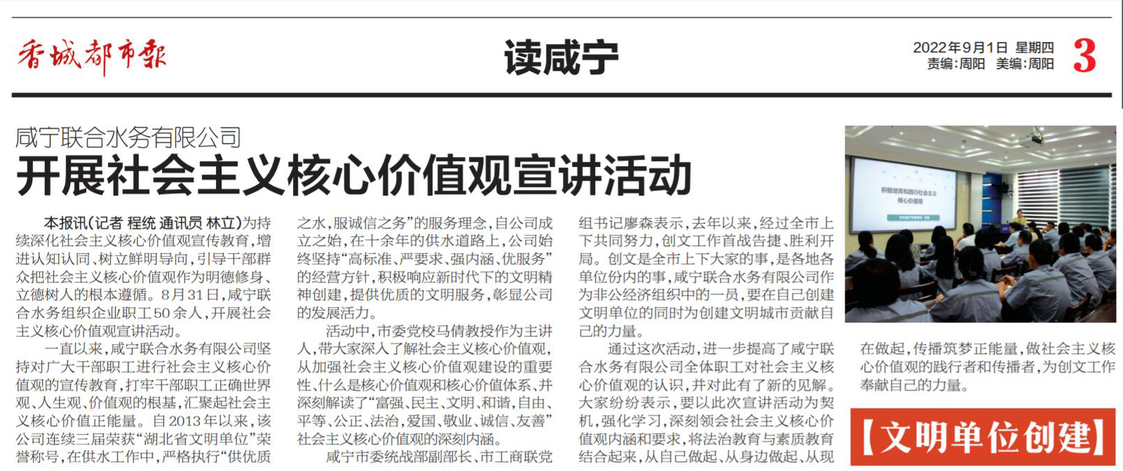 圖∶《香城都市報》刊登相關新聞 為進一步推進社會主義核心價值觀宣傳工作,提高公司職工精神文明素質。8月31日,咸寧聯合水務有限公司與中共咸寧市委宣傳部、咸寧市工商聯共同開展“社會主義核心價值觀宣講”活動。此次活動由市委黨校馬倩老師主講,咸寧市委統戰部副部長、市工商聯黨組書記廖森、咸寧聯合水務有限公司總經理毛雄輝等領導出席本次宣講活動。