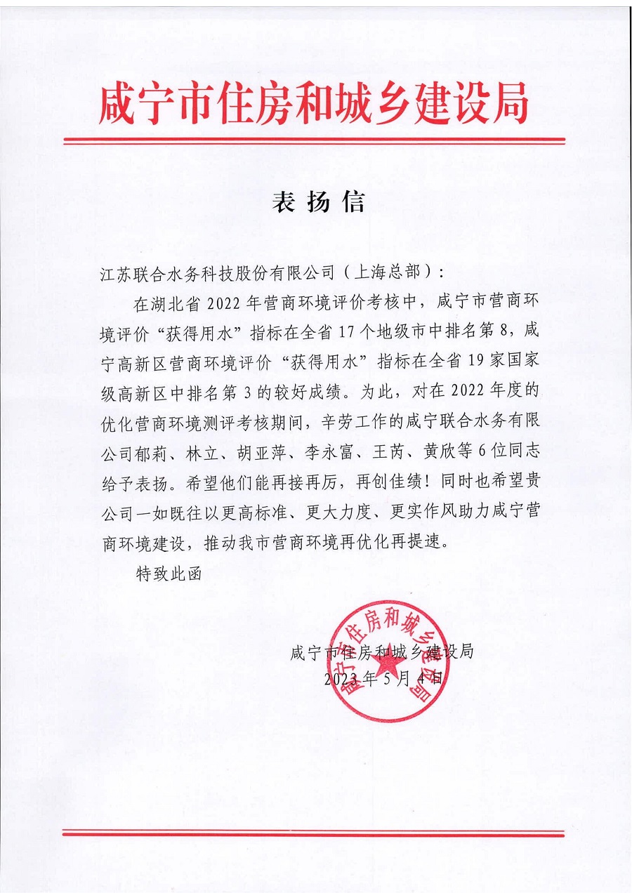 近日,湖北省咸寧市住房和城鄉(xiāng)建設局向聯(lián)合水務發(fā)來一封表揚信,對江蘇聯(lián)合水務科技股份有限公司旗下全資子公司咸寧聯(lián)合水務有限公司2022年度優(yōu)秀營商環(huán)境小組成員進行通報表揚,他們分別是客戶服務副總經理郁莉、客戶服務部經理林立、市場拓展部副經理胡亞萍、客戶服務部抄收主管李永富、市場拓展部市場專員王芮、行政管理部行政助理黃欣。此次通報表揚,彰顯了湖北省咸寧市住建局對聯(lián)合水務履行企業(yè)責任、助力咸寧市營商環(huán)境建設的充分肯定與高度贊揚。