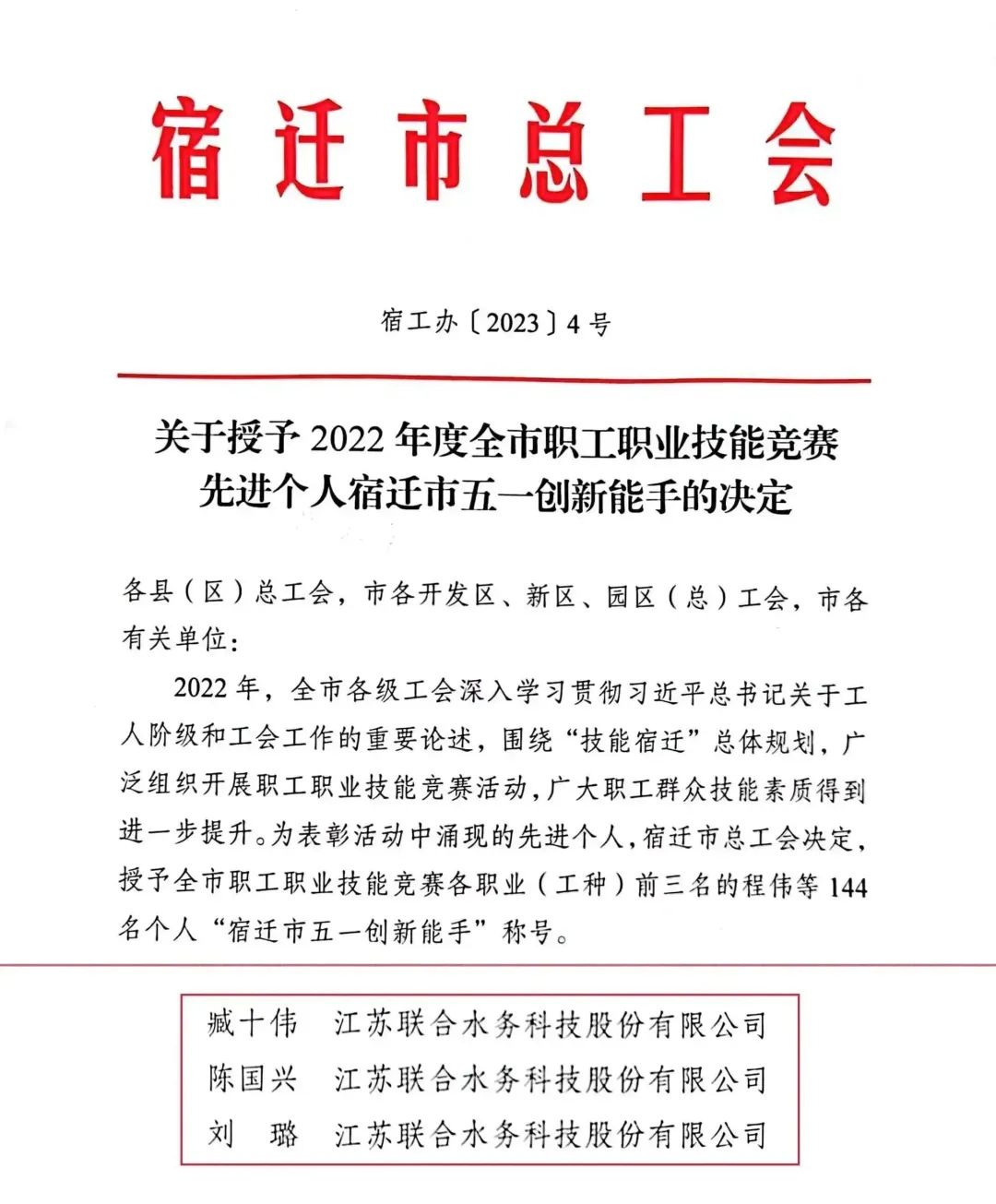近日,江蘇省宿遷市總工會舉行表彰活動,向2022年度全市在勞動和技能競賽等活動中涌現的先進集體和個人給予了崇高的贊譽。聯合水務宿遷供水公司多名員工榮獲“宿遷市五一勞動獎章”和“宿遷市五一創新能手”榮譽稱號。這一榮耀的加冕,既是對他們辛勤工作與誠實勞動的充分認可,也是對他們為城市發展作出卓越貢獻的積極鼓勵。 “宿遷市五一勞動獎章”獲得者:臧十偉 “宿遷市五一創新能手”獲得者:劉璐、臧十偉、陳國興