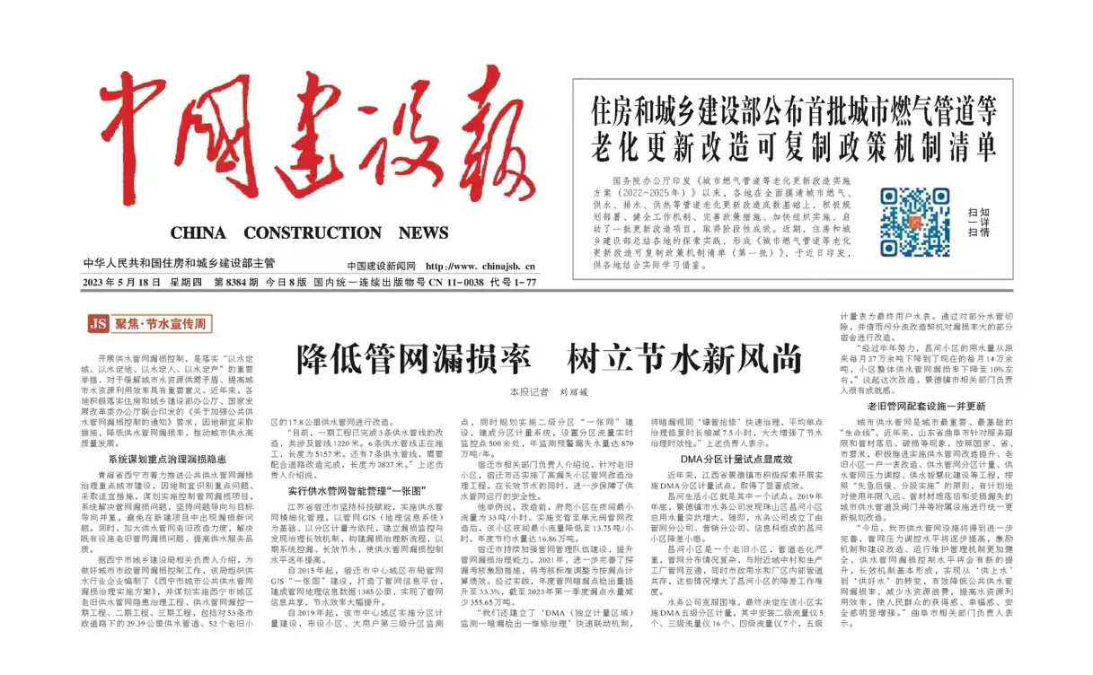 5月18日,中國建設報針對聯合水務的供水管網建設,發布了“降低管網漏損率,樹立節水新風尚”為題的相關報道。該報道從GIS“一張圖”、分區“一張網”和快速聯動機制等多個方面,概述了公司為降低供水管網漏損做出的努力。降低供水管網漏損對于提高水資源利用效率,保障城區安全穩定供水具有重要意義。公司在中心城區實施管網精細化管理,以管網GIS為基礎,做好DMA分區計量和壓力管理工作,制訂內控標準,提高搶維修速度與質量,建立“DMA分區計量監控-漏點檢出-修復治理”的快速聯動機制,不斷提高漏損治理的水平,實現系統控漏、長效節水,為宿遷的安全供水提供可靠保障,勇擔責任,守護城市供水的“生命線”。
