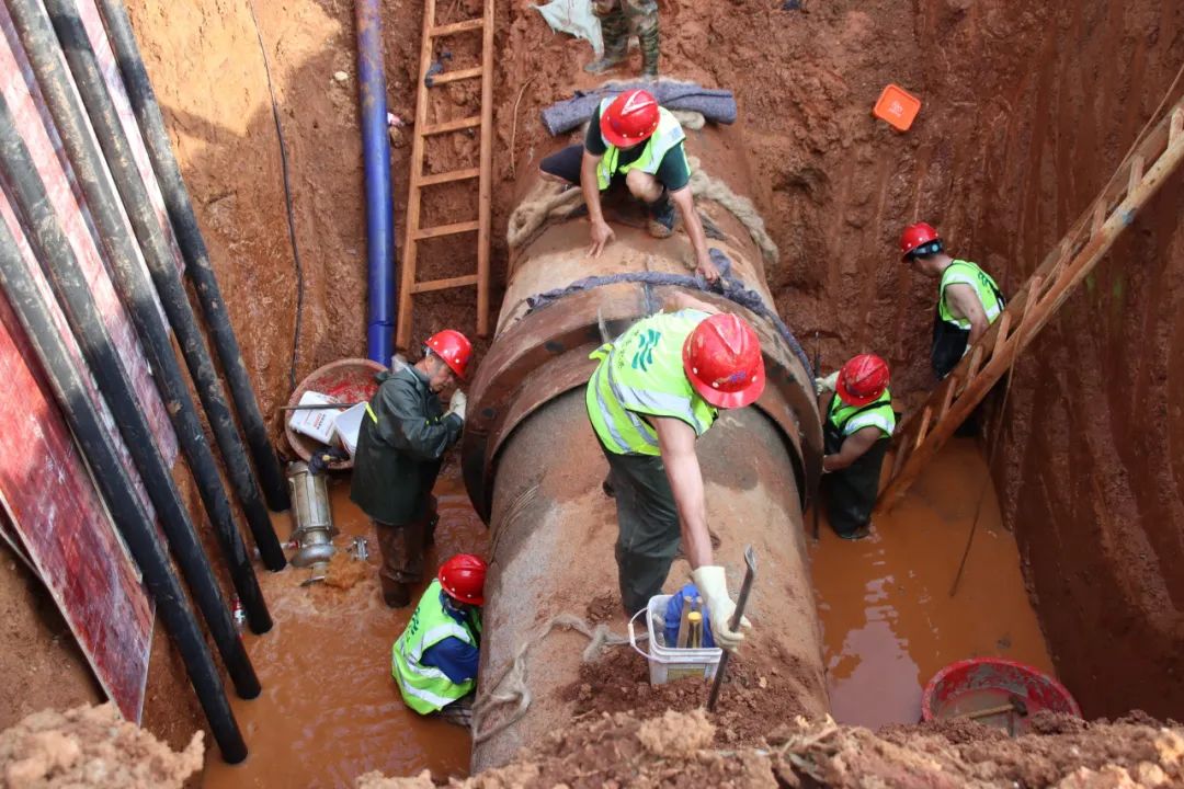 無懼“高”溫,做好應(yīng)急搶修 夏季作為一年之中的用水高峰期,季節(jié)的特殊性使得管道爆管、漏水現(xiàn)象發(fā)生頻率較高,供水管道搶修量比其他時間段明顯增加。7月12日,通江大道大屋吳附近DN1200mm供水管網(wǎng)因老化發(fā)生漏水,咸寧聯(lián)合水務(wù)多部門聯(lián)動火速趕赴現(xiàn)場了解情況,并迅速啟動應(yīng)急搶修預(yù)案,第一時間緊急調(diào)配挖掘機(jī)、發(fā)電車、抽水機(jī)等大型搶修機(jī)具進(jìn)行增援,安排應(yīng)急搶修專班趕往事發(fā)現(xiàn)場,迅速開展現(xiàn)場勘察、確定漏點具體情況、設(shè)立全面安全防護(hù)措施等搶修前期工作。在搶修期間,面對管徑大、時間緊、施工作業(yè)環(huán)境復(fù)雜等諸多難題,搶修人員齊心配合、攻堅克難,井然有序地開展漏點測定、降水開挖、焊接維修、沖洗試壓等一系列搶修和恢復(fù)工作,天氣炎熱,施工人員早已汗流浹背,但他們不畏艱難酷暑,堅守崗位,歷經(jīng)三十六個小時的晝夜奮戰(zhàn),完美完成DN1200主管道的維修和保養(yǎng),未對城區(qū)供水造成任何不良影響。