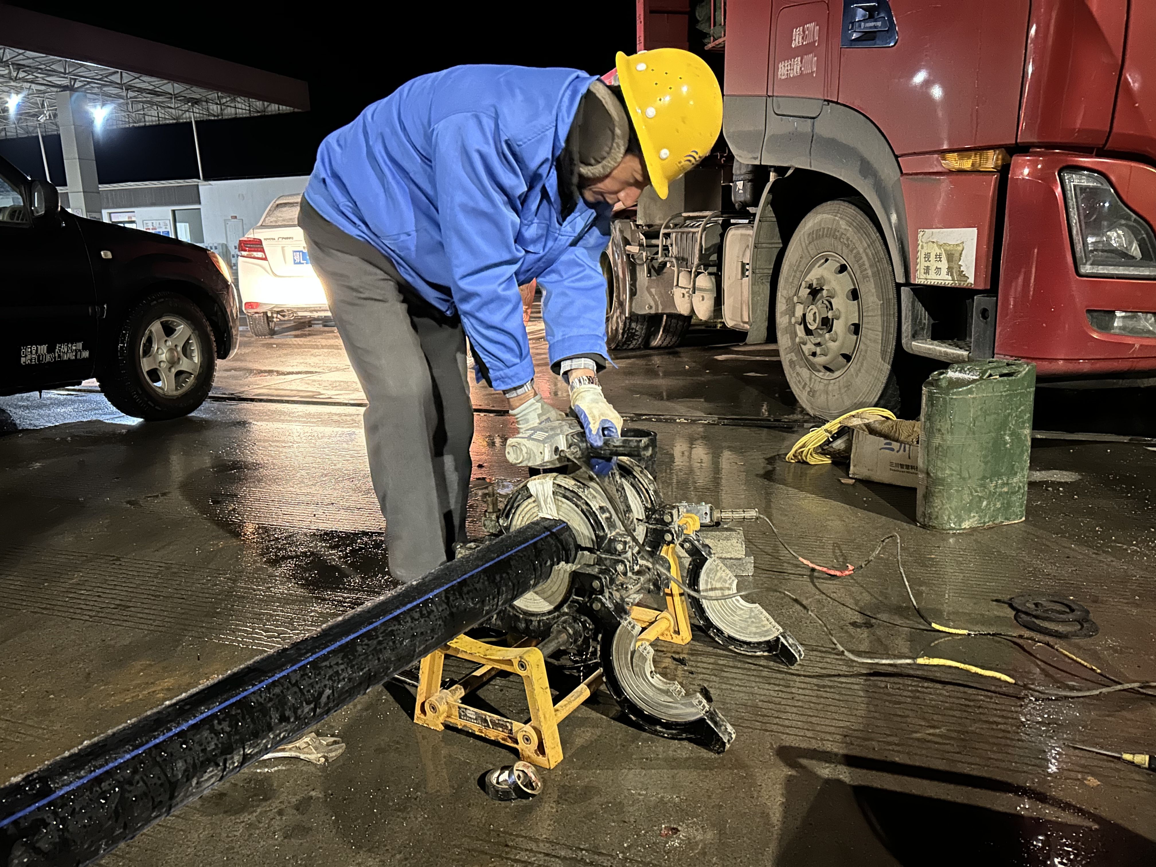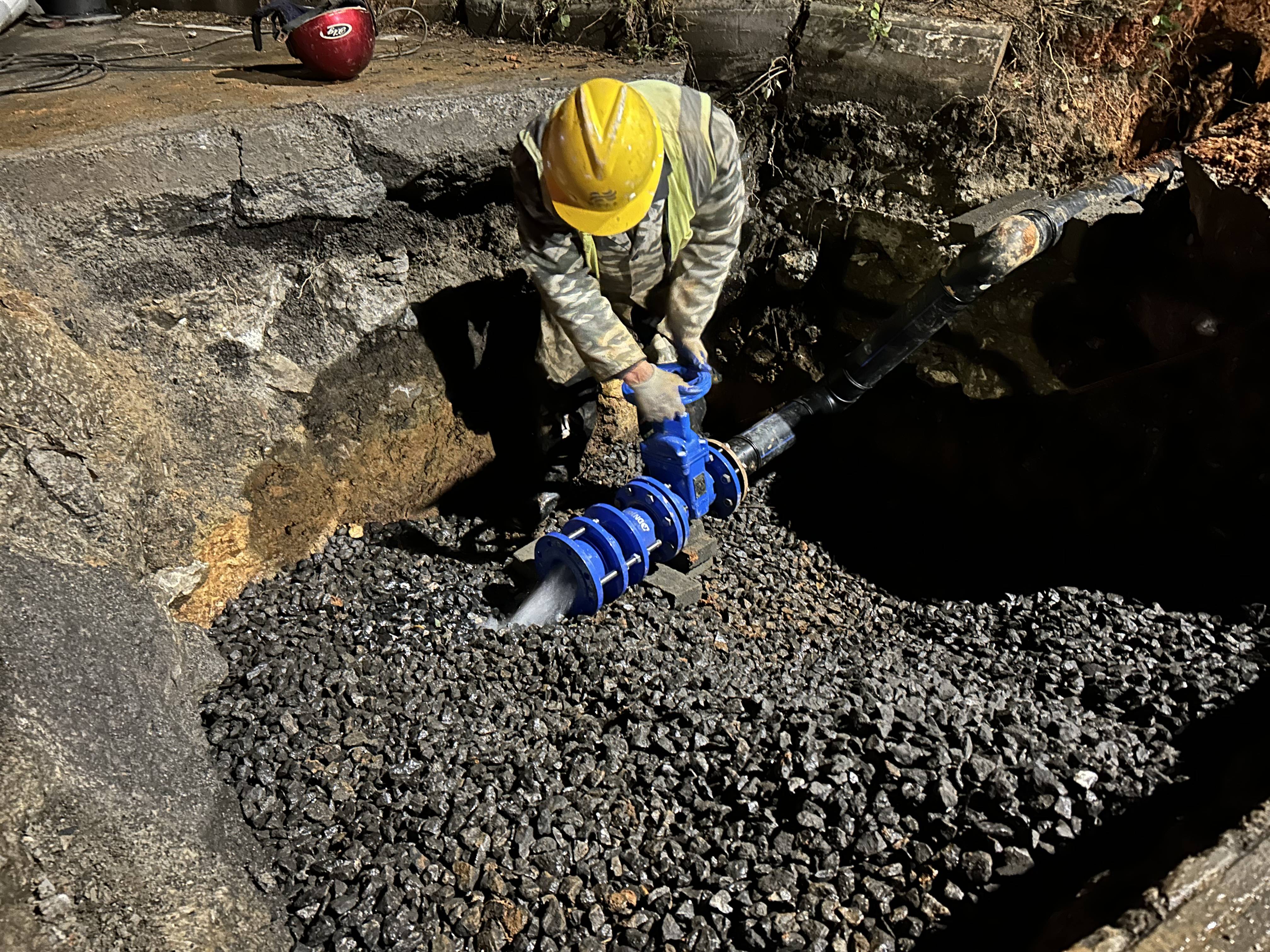 在“人、材、機(jī)、料”全部到位后,工作人員按照原定施工計(jì)劃開始施工。工程部和管網(wǎng)部同事先關(guān)閉距碰通處三千米處,巨寧大道咸安大道交匯處的DN300閥門。在管網(wǎng)部關(guān)閉閥門,確認(rèn)閥門無(wú)水后,再打開DN150排污閥,待水排干后靜待下一步施工。因?yàn)樵撻y在路邊,為了保證施工安全,所有施工人員都必須守在施工現(xiàn)場(chǎng)。夜晚寒風(fēng)凜凜,天空飄起小雪,凌晨的溫度凍得現(xiàn)場(chǎng)的工人們直打哆嗦,即使手和臉被凍得通紅,卻仍沒有阻止我們施工隊(duì)伍的腳步,他們依然堅(jiān)守陣地,迎風(fēng)戰(zhàn)雪誓要打贏這場(chǎng)“供水保衛(wèi)戰(zhàn)”。待水排干用了兩個(gè)半小時(shí)后,工程部和質(zhì)安部的同事開始指揮現(xiàn)場(chǎng)的工人們?cè)谠?/span>DN300管道處進(jìn)行開口。開口瞬間,管道里的水涌出,打濕了工人的衣服,為了不影響施工進(jìn)程,工人簡(jiǎn)單處理后便繼續(xù)作業(yè),終于在次日凌晨4:30提前恢復(fù)供水,完美完成碰通工作。