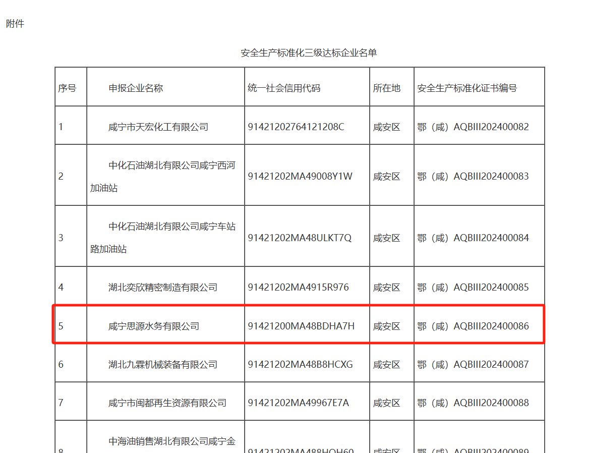 | 咸寧思源水務有限公司榮獲“安全生產標準化三級企業”稱號 | ||