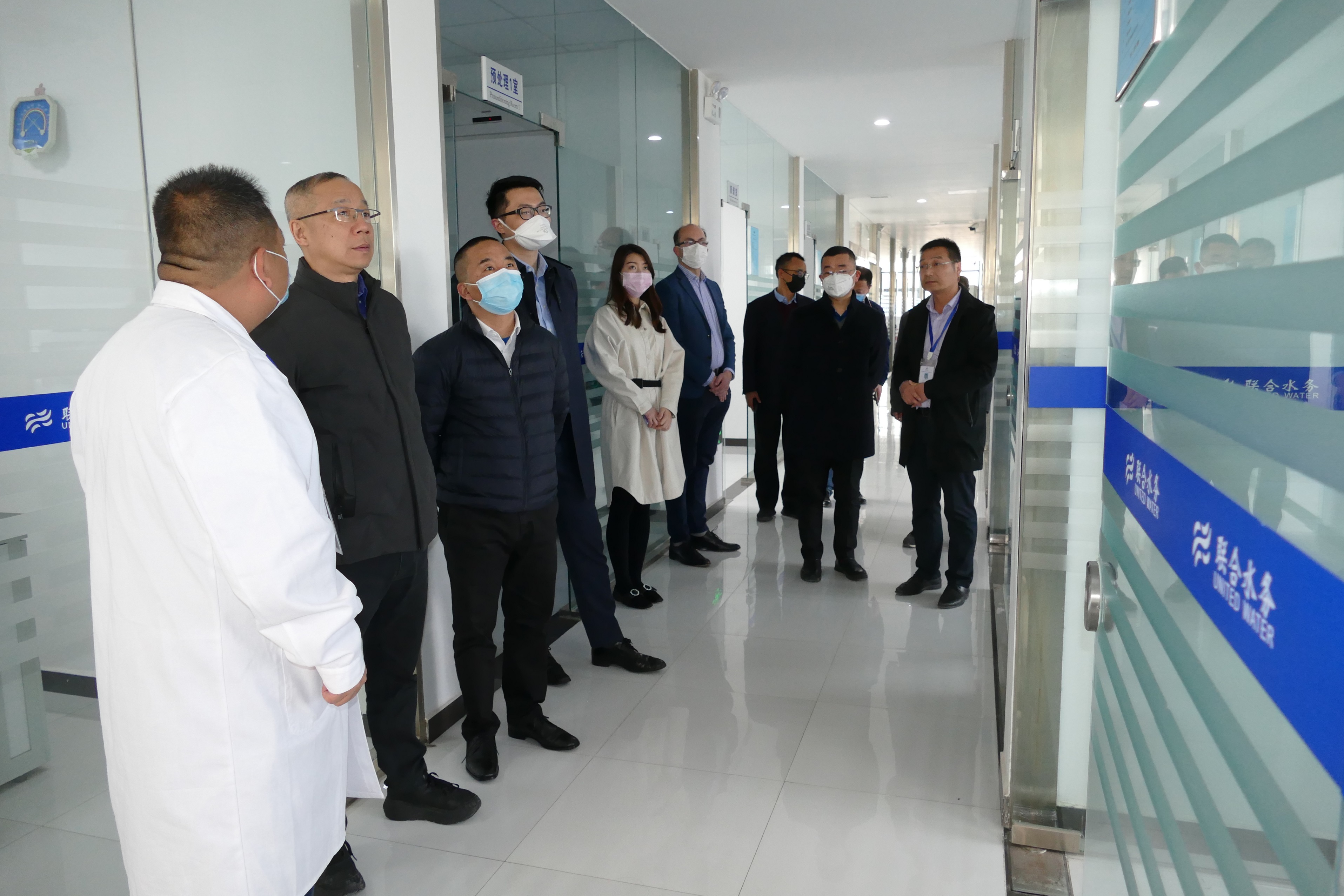 圖2:俞總裁一行視察水質檢測中心 自水檢大樓走出,穿過生產區,途中俞總裁不時關心生產人員配置、輪班制度、廠區標識標記定期更新等細節。最后,俞總裁一行來到位于辦公區的供水調度中心,液晶大屏上生產過程中濁度、PH值等工藝參數、各供水區域水壓、各二次供水泵房實時運行情況以及供水管網GIS系統等一覽無余,信息量非常強大。俞總裁一行在大屏前認真觀看,工作人員對他們提出的問題進行了現場演練,宿遷公司的科學供水調度和公司向智慧化水企邁進的步伐得到了一致肯定,俞總裁倍感欣慰,叮囑大家一定要不斷進取,從源頭到水龍頭,為宿遷百姓提供最優質的供水服務。宿遷公司總經理曾真代表全體員工對俞總裁的關懷與激勵表示由衷的感謝,并表態,宿遷項目全體員工將永遠秉持聯合水務發展理念,供優質之水,服誠信之務!