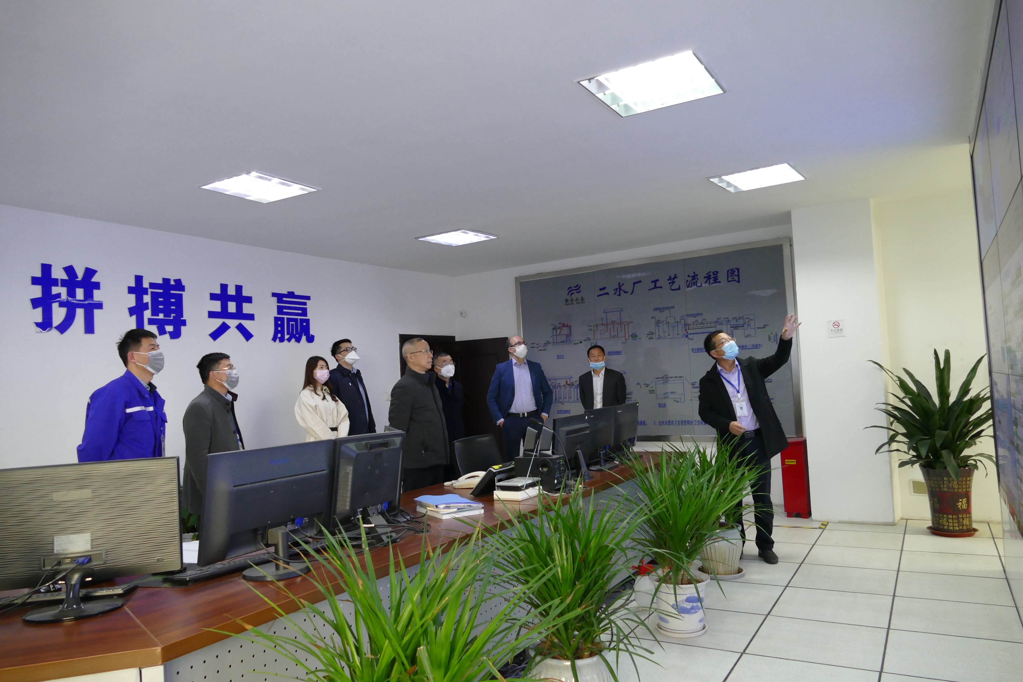 冬已去,春歸來。一方熱土,一份情懷。 3月30日下午,聯合水務集團董事長兼總裁俞偉景先生率集團高級副總裁劉猛先生、陳樵先生、JamesBeeson先生和羅斌副總裁蒞臨宿遷項目公司視察指導工作,隨行的還有總裁助理兼財務總經理陳國清先生、證券事務部總經理許行志先生。宿遷項目公司總經理曾真全程陪同視察。 不顧舟車勞頓,俞總裁一行首先來到在建的第二水廠四期擴建工程現場。集團建設管理部副總經理葉峰向俞總一行介紹項目概況及進展情況。第二水廠四期擴建項目是在母公司聯合水務集團大力支持下,宿遷公司為適應宿遷市經濟社會的快速發展,未雨綢繆建設的工程,是宿遷市重點民生工程。該工程占地約39.37畝,建設規模15萬噸/日,建設采用網格絮凝+平流沉淀池與清水池疊合工藝,使水處理構筑物結構更緊湊, 提升了土地使用率,凈水工藝采用先進的“臭氧+活性炭”的深度處理方式。該工程于2019年9月開工建設,今年7月高峰供水來臨前投入運行,屆時,宿遷項目公司的供水能力將達43萬噸/日,極大滿足城市發展供水需求。疫情給工程建設造成了一定的阻擾,但項目部在積極響應政府各項防控疫情政策前提下,千方百計克服困難,保證工程建設進度,目前各項施工及設備采購、安裝已逐漸步入正軌。俞總裁對四期擴建項目的設計規劃、土建施工、建設管理等給予了充分肯定,并提出了繼續努力,按期保質保量完成項目建設,為宿遷百姓安全供水做好保障的殷切期望。
