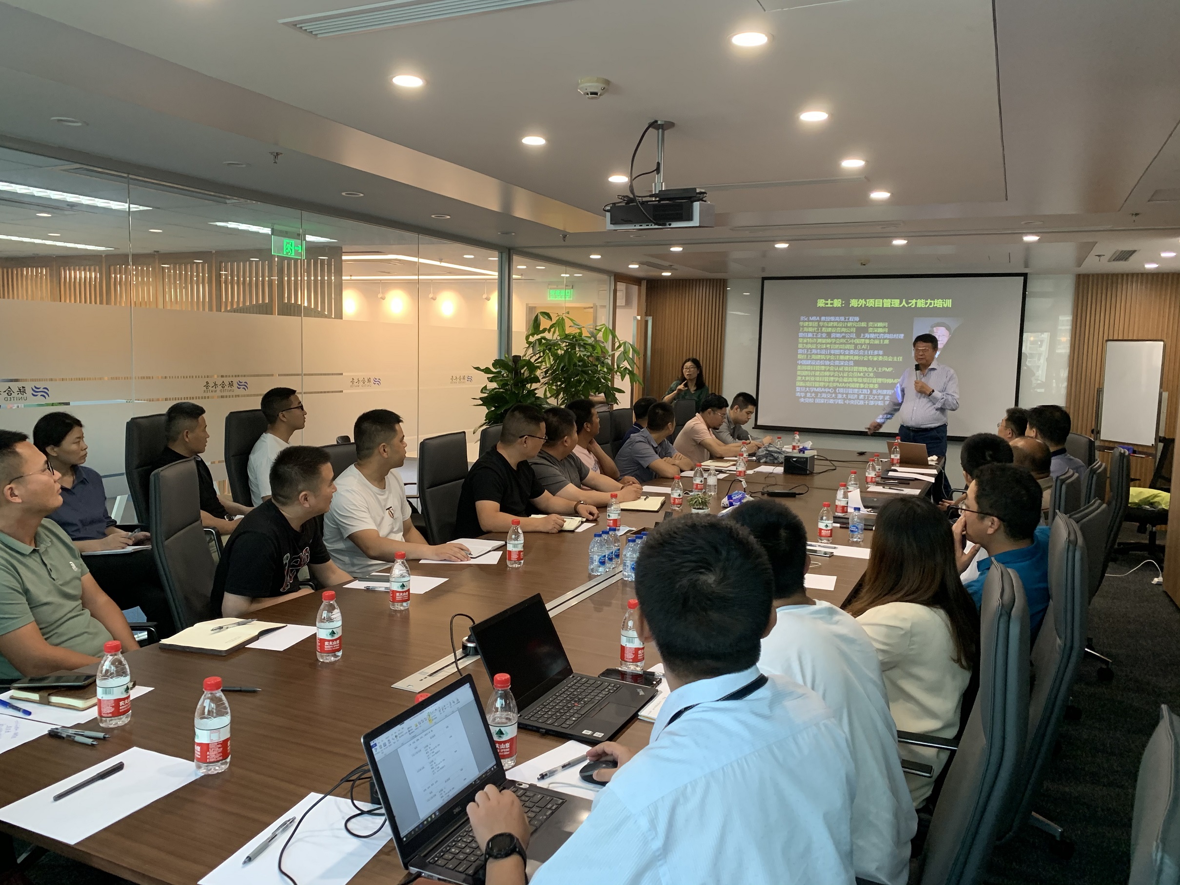 圖2:外聘教授及高級工程師梁士毅先生給學員授課 通過本期培訓,使得參訓的全體成員了解了國際項目管理理論和方法,并掌握了一定的國際項目管理技能,同時深刻理解了國際工程投標技巧及要點,彌補了之前在國際項目工程中的技術及商務思維短板,培訓效果顯著。 隨著孟加拉國首都達卡供水PPP項目的繼續推進,結合本次培訓,大家堅信聯合水務在國際化的發展進程中將會邁開步伐,越走越遠。雄關漫道真如鐵,而今邁步從頭越,大家躊躇滿志,誓為聯合水務集團的國際化發展之路做出更大的貢獻!