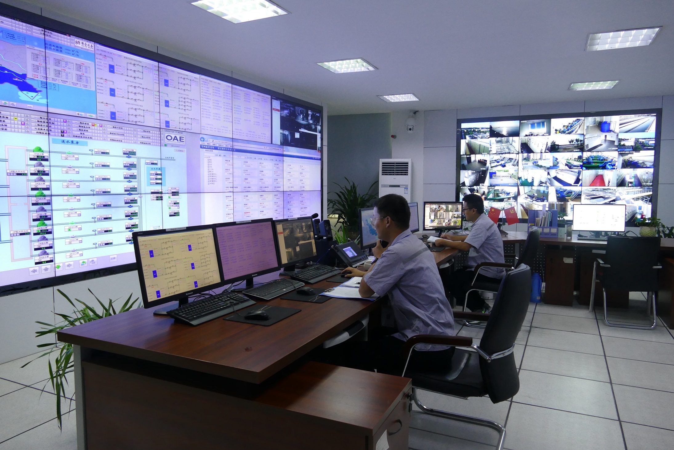 圖4:水檢人員做水質化驗 調度中心把好“供水科學調度”關 隨著供水規模的不斷擴大,公司斥資一百多萬元對調度中心進行了整裝重修,更換了液晶數字大屏,直觀、實時、全方位顯示各種信息,包括工藝控制、供水管網信息、二次供水信息、視頻監控等。調度中心實行24小時人員值守,充分發揮供水“大腦中樞”的重要作用。供水調度人員,每天都要時刻關注著電腦和電子大屏上的數據參數,一旦發現異常,立即匯報。看屏幕久了,眼睛生澀,疼痛難忍,但是,因為心中有責任,他們心無旁騖,堅守崗位,確保每一滴水的科學優化分配。