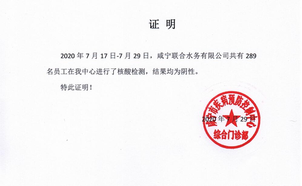圖2:咸寧聯合水務員工檢測結果均為陰性 疫情期間,咸寧聯合水務全員參與,凝心聚力。124名供水員工堅守安全生產供水一線,確保城區每日近16萬噸供水安全;33名青年員工參與市住建局組織的志愿者活動,奔赴城區21個物業小區,協助小區物業開展疫情防控工作;17名黨員干部主動下沉小區一線,將“堡壘”筑在疫情防控最前沿…… 千淘萬漉雖辛苦,吹盡狂沙始到金。經過全體職工的齊心協力,咸寧聯合水務受到主管部門市住建局的贊揚與肯定,并收到其《感謝信》一封,中國共產黨咸寧市委員會、咸寧市人民政府為33名志愿者頒發“抗疫貢獻榮譽證書”,參與防疫值守的小區中共14個小區在《關于在新冠肺炎疫情防控期間對物業企業實行“紅黑榜”管理的通知》中獲得通報表揚,榮登“紅榜”…… 聯合水務多年來堅持“以人為本,服務至上”,始終將職工生命安全和身體健康放在首位,保證全體職工在關鍵時刻站得出來,在危急關頭頂得住,牢牢守住安全生產底線,為確保城市供水安全保駕護航。 |