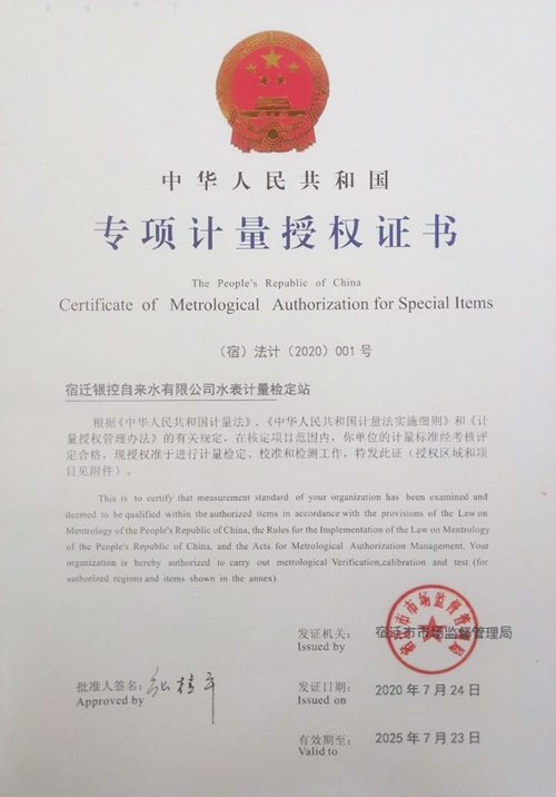 經(jīng)過現(xiàn)場(chǎng)嚴(yán)格考核,根據(jù)《中華人民共和國計(jì)量法》、《中華人民共和國計(jì)量法實(shí)施細(xì)則》、《計(jì)量授權(quán)管理辦法》的有關(guān)規(guī)定,考核組認(rèn)為:宿遷銀控自來水公司水表計(jì)量檢定站,嚴(yán)格按照宿遷市市場(chǎng)監(jiān)督管理局要求開展水表計(jì)量檢定工作,全面履行《計(jì)量法》賦予的職責(zé)和義務(wù),依法辦事,為政府行政計(jì)量部門實(shí)施計(jì)量監(jiān)督提供可靠的技術(shù)保證,圓滿通過現(xiàn)場(chǎng)考核。8月7日,檢定站取得中華人民共和國《專項(xiàng)計(jì)量授權(quán)證書》。更為欣喜的是,本次《專項(xiàng)計(jì)量授權(quán)證書》授權(quán)期限由往常的3年延長(zhǎng)至5年,授權(quán)有效期至2025年7月23日。 |