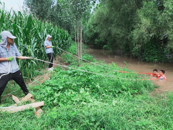8月19日午時,隨著洪峰的即將到來,污水廠存在河水通過入河排污口倒灌進廠的風險。接到通知后,廠長周磊連午飯都未來得及吃,第一時間報告總經理楊坤,一同帶領機電班等人員趕赴現場,爭分奪秒利用盲板和閘門對汾河堤壩南北兩端的入河排污口進行雙重封堵。由于上漲的水位已淹沒南端入河排污口,需要人員下河操作,現場人員紛紛自告奮勇要求下水封堵,最后由水性較好的機電班原文琦和楊樂鵬負責水下作業。原文琦、楊樂鵬不顧個人安危,做好安全防護后跳入渾濁湍急的河水中,與岸上人員密切配合,經過近半個小時的奮戰,順利封堵住了入河排污口,解除了汾河水倒灌的危機。看到濕漉漉爬上岸的兩人,雖然滿身泥濘臉上卻掛著勝利的笑容,岸上全體人員終于放下了懸著的心。