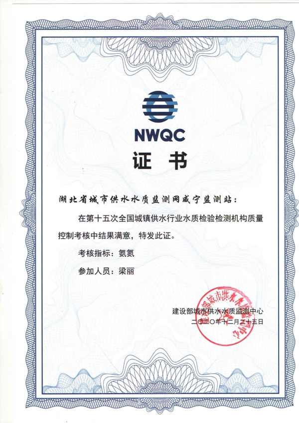 為加強(qiáng)城鎮(zhèn)供水水質(zhì)檢驗(yàn)檢測(cè)機(jī)構(gòu)的質(zhì)量控制,促進(jìn)檢測(cè)能力和管理水平提升,住建部城市供水水質(zhì)監(jiān)測(cè)中心于2020年組織開(kāi)展《第15次全國(guó)城鎮(zhèn)供水行業(yè)檢驗(yàn)檢測(cè)機(jī)構(gòu)生活飲用水氨氮項(xiàng)目的質(zhì)量控制考核》,香泉水檢公司暨湖北省城市供水水質(zhì)監(jiān)測(cè)網(wǎng)咸寧監(jiān)測(cè)站報(bào)名參加了本次能力驗(yàn)證活動(dòng)。2020年9月2日,公司順利完成了氨氮能力驗(yàn)證考核樣品檢測(cè)。近日,公司接到了住建部頒發(fā)的能力驗(yàn)證結(jié)果通知書(shū),順利通過(guò)本次水中氨氮項(xiàng)目的能力驗(yàn)證,取得了“滿(mǎn)意”結(jié)果。