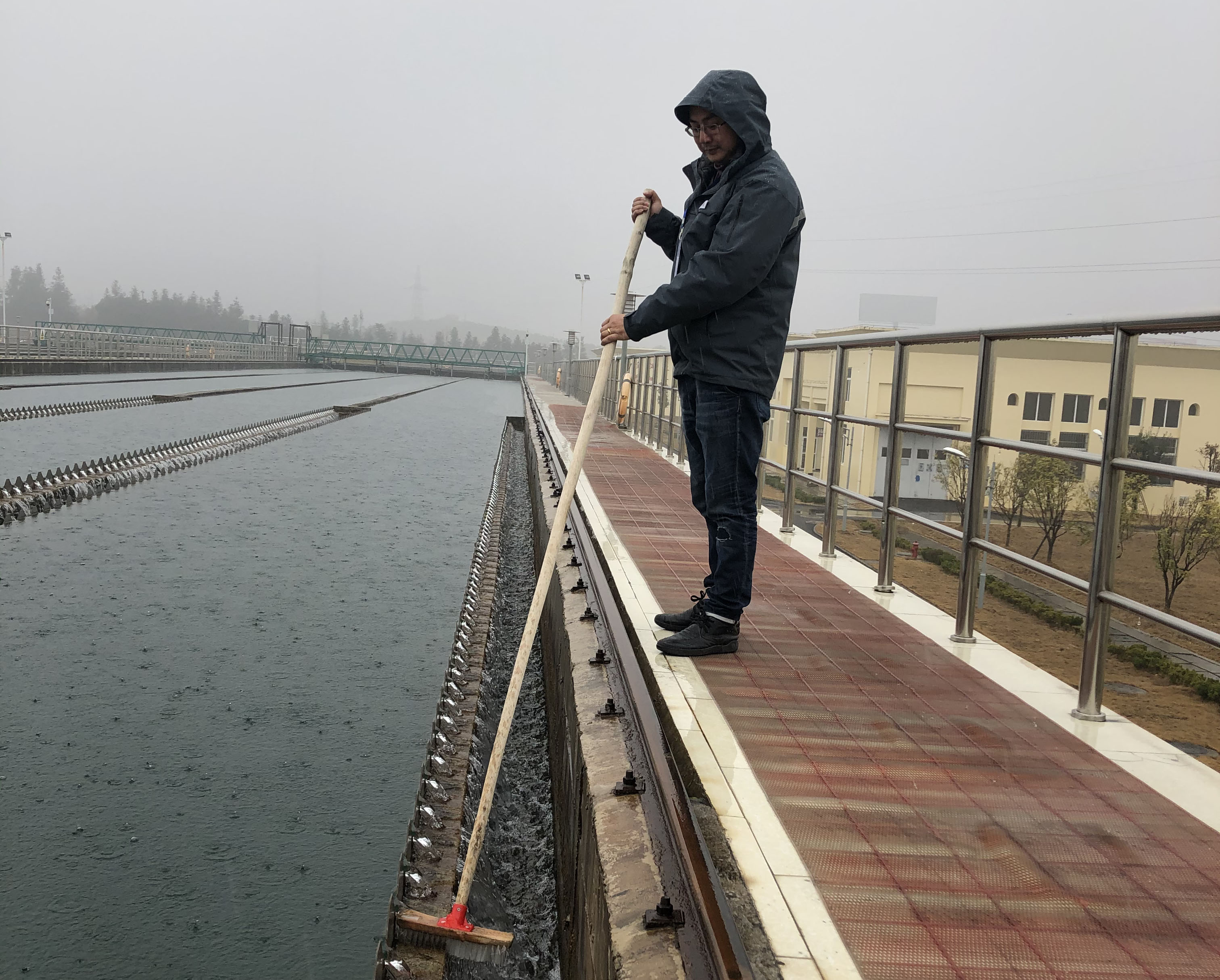 黃智淵正在檢查機(jī)電設(shè)備 在王英水廠的平流沉淀池上,陳鋒冒著大雨正在進(jìn)行清理工作。新年第一天,天公不作美,下起了磅礴大雨,但是為了保障佳節(jié)期間供水生產(chǎn)無(wú)患,咸寧聯(lián)合水務(wù)制水部的一線員工們放棄了在家過(guò)節(jié)的機(jī)會(huì),冒雨堅(jiān)守在制水生產(chǎn)線上,時(shí)刻保障城市供水無(wú)礙。