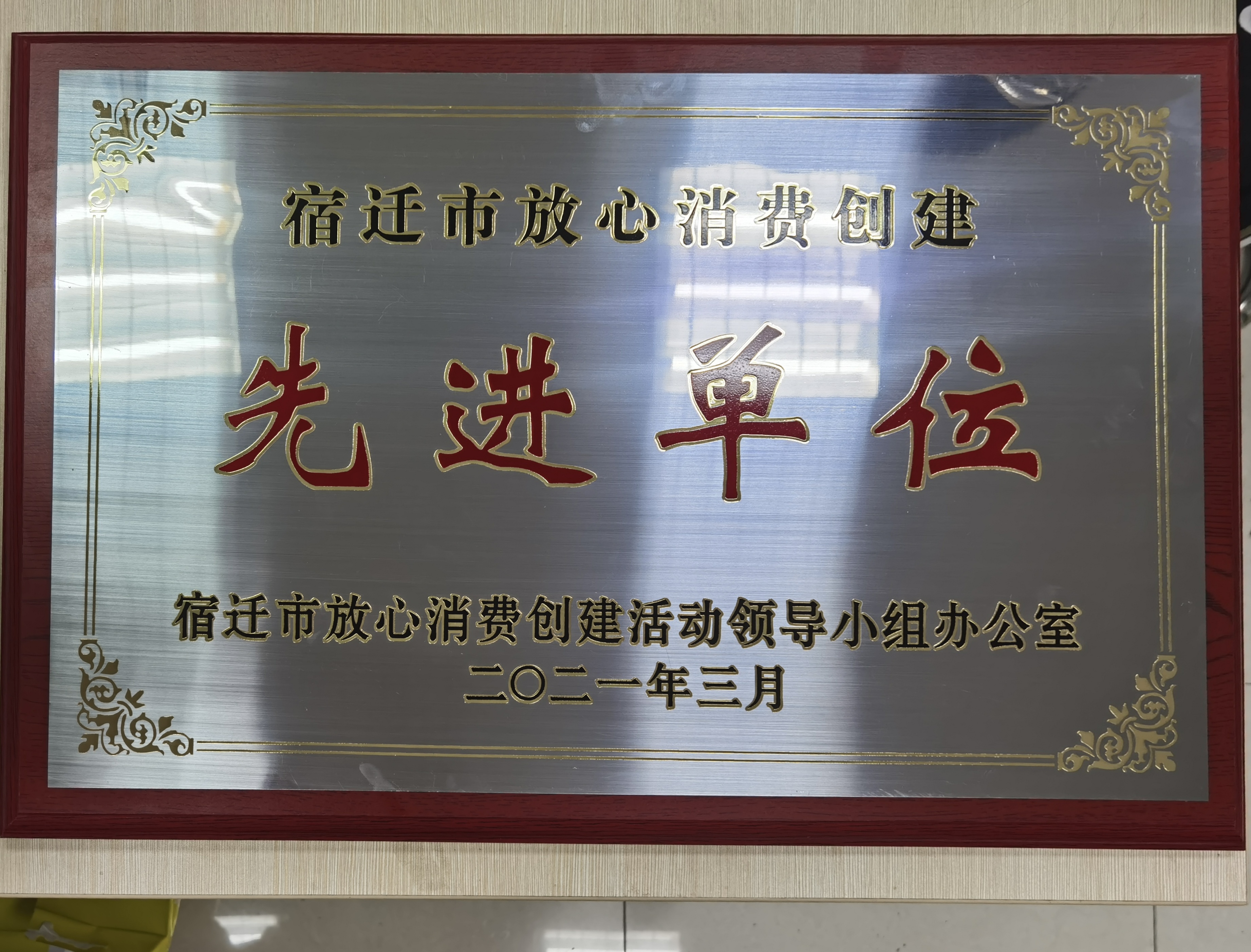 圖:“宿遷市放心消費(fèi)創(chuàng)建先進(jìn)單位”獲獎(jiǎng)證書