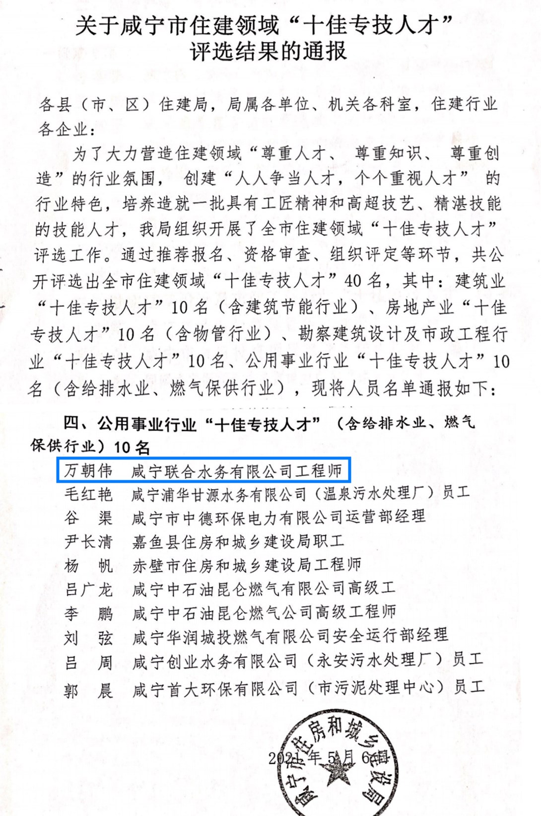 近日,由咸寧市住房和城鄉建設局組織開展的全市住建領域“十佳專技人才”評選工作結果名單已揭曉。在此次評選中,咸寧聯合水務有限公司機電設備部工程師萬朝偉榮獲“公用事業行業‘十佳專技人才’”稱號。