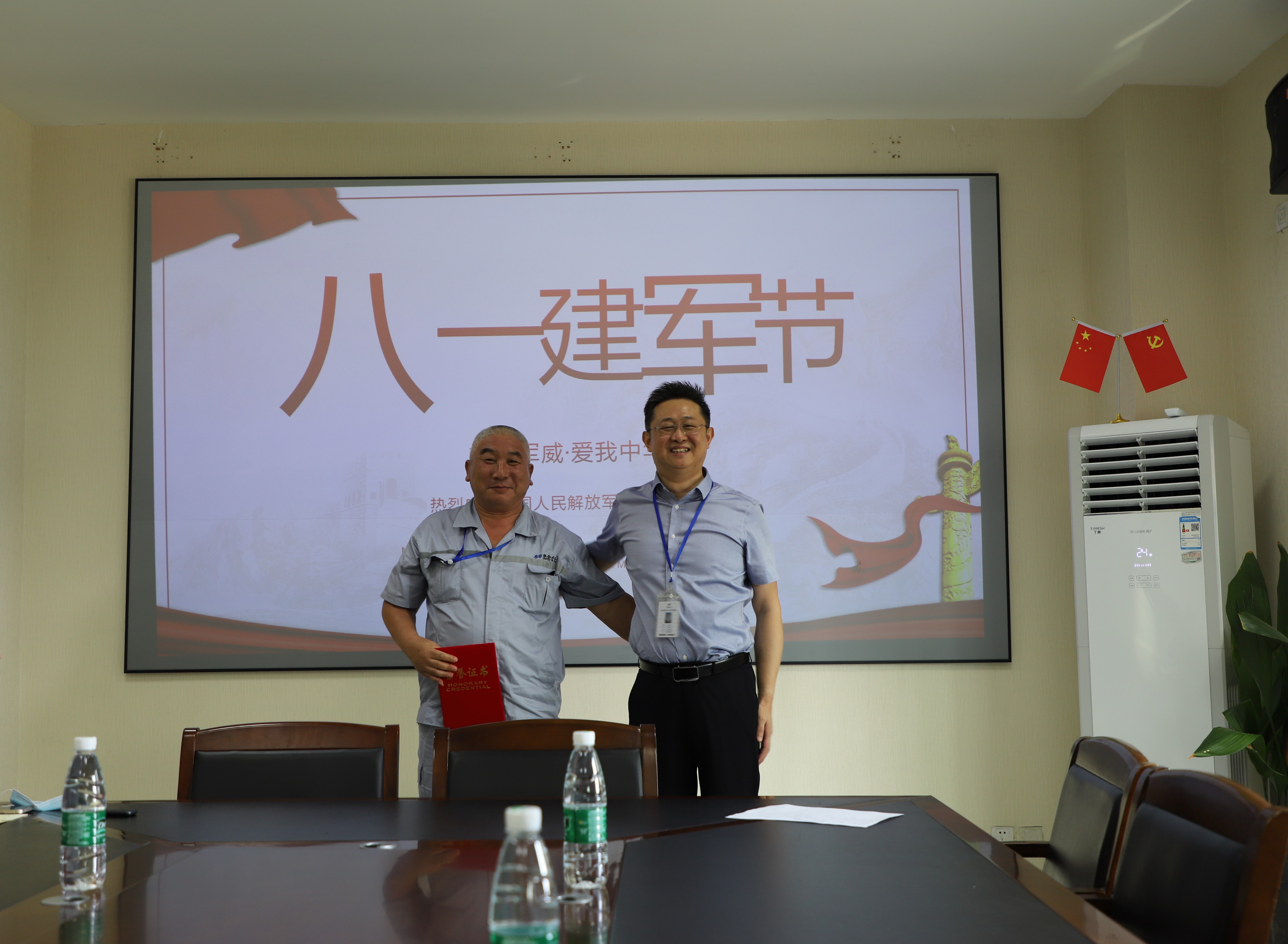 為慶祝即將到來的“八一建軍節”,江蘇聯合水務科技股份有限公司宿遷公司組織退伍在職員工開展慶祝“八一建軍節”活動。退伍不褪色,換裝不換心,曾經,錚錚鐵骨戰沙場,保家衛國,而今,盡心竭力保供水,守衛家園生命線。在這特殊的節日,向公司四十三名退伍軍人在職員工致敬!向全國光榮的軍人致敬! 7月30日上午,在公司二水廠二樓會議室,退伍軍人員工代表近20人集聚一堂。首先,也曾經一身戎裝的公司客服運營副總經理尹邦交,代表公司為評選出的五位“最美退役軍人”——周允勝、孟慶葉、韓江、臧十偉、馬強頒發了榮譽證書,對他們不忘軍人本色,繼續發揚軍人不怕苦、不怕累的精神,在平凡的供水崗位上忘我奉獻的高尚品質給予了充分肯定。