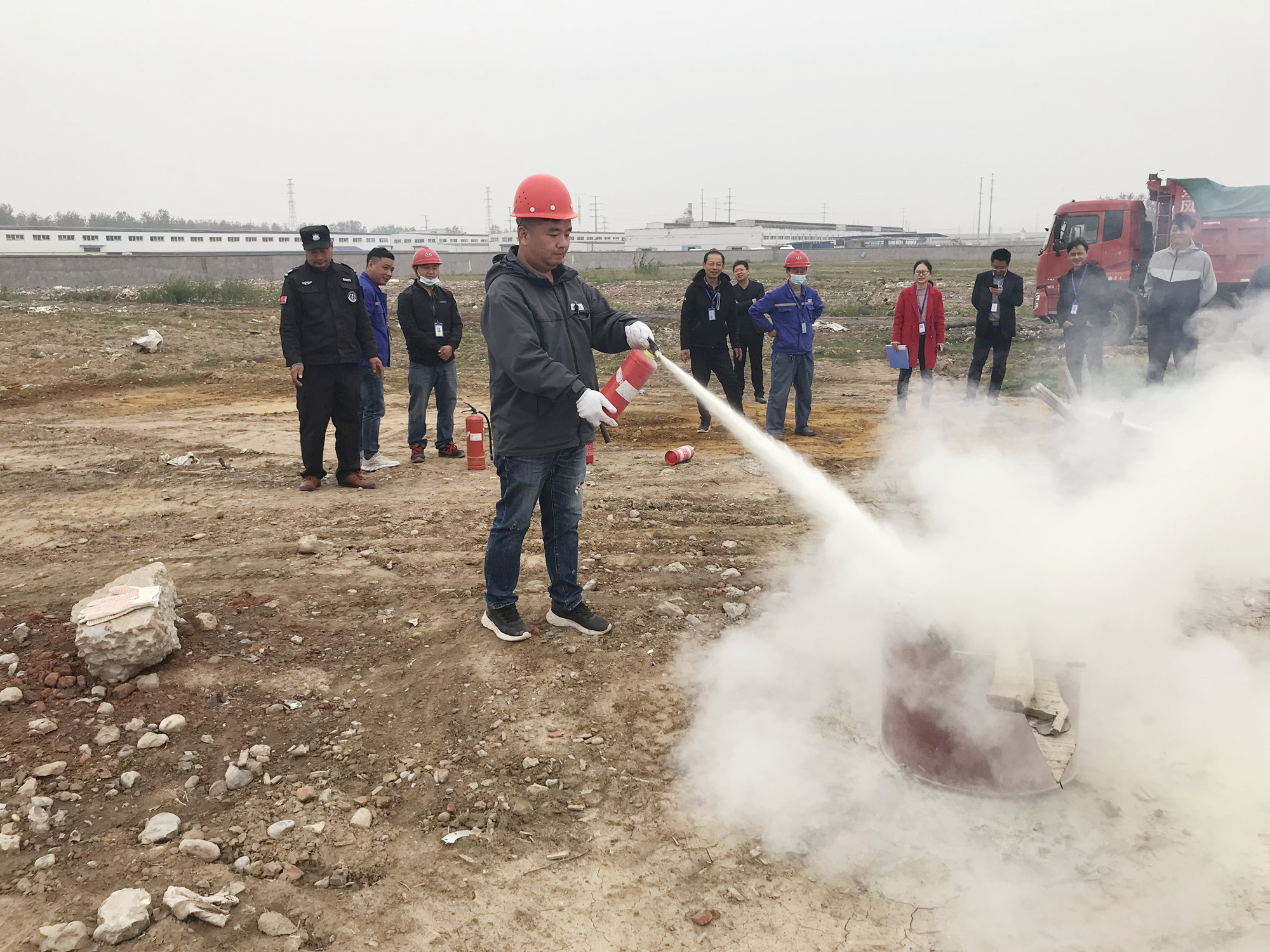 上午10點,總指揮許應濤宣布消防應急演練正式開始。本次演練預設二期提標改造施工場地某處發現火災險情,公司隨即啟動火災搶險應急處置預案。應急小組成員扛起滅火器以迅雷不及掩耳之勢奔赴火情處,面對熊熊燃燒的大火、滾滾升起的濃煙,應急小組成員沉著冷靜,從容應對,在距離火源1米的上風口處,熟練地按照滅火的步驟和方法,成功將柴油燃起的濃煙大火撲滅。隨后,公司組織部分員工現場體驗滅火器滅火的過程,切實提高員工面臨火災的應急自救能力。最后,總指揮許應濤對此次演練過程中的不足之處進行了總結點評。