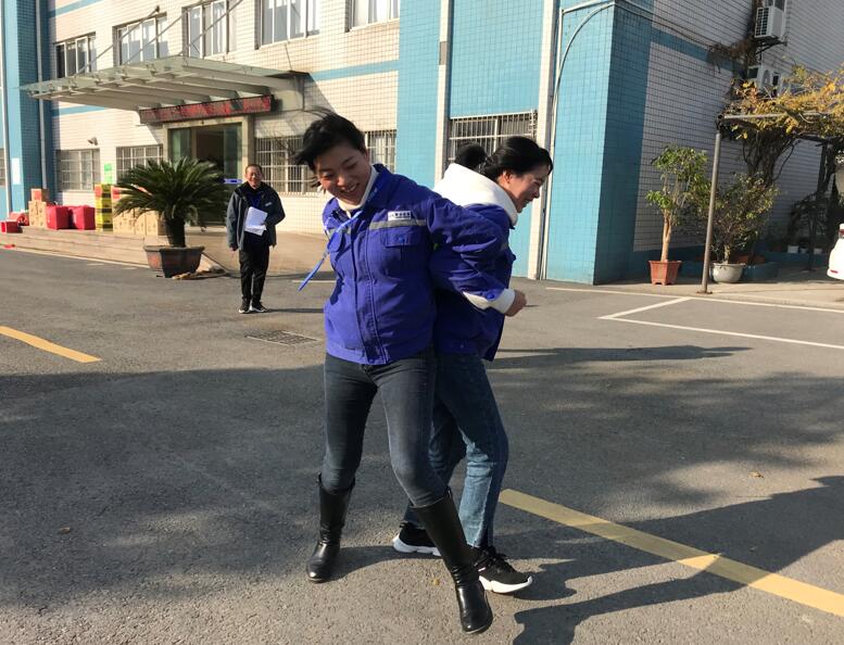 圖:“企鵝漫步”活動現場 第四個項目是“螃蟹背西瓜”:兩名參賽選手背對背站立,用背夾球,步調一致向前進,若途中球掉落或用身體其他部位觸碰球則須返回起點重新開始。參賽的巾幗須眉們斗志昂揚、分秒必爭、奮力奪冠,觀賽員工滿腔熱忱的喝彩鼓勁兒。葉向上、廖小康隊以長腿的絕對優勢一路高歌猛進,率先沖出終點,贏得陣陣喝彩。