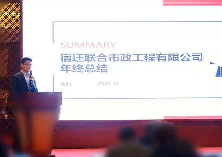 宿遷聯合市政工程有限公司總經理梁丹對2021年度工程公司工作進行了匯報,通過柱形圖對比展示了2021年的工作成果,各項指標穩步增漲,實現了一年業績的高質量發展。在這一年中,公司管理向更精更細發展,不斷提升,打出安全文明施工、泵組汽蝕控制、標準化泵房推廣、人才培養等組合拳。粱總帶領團隊制定了新的一年經營目標,明確新一年的經營策略,在新的一年中加大人才培養力度,增強公司組織建設能力,為公司進一步發展增添助力。