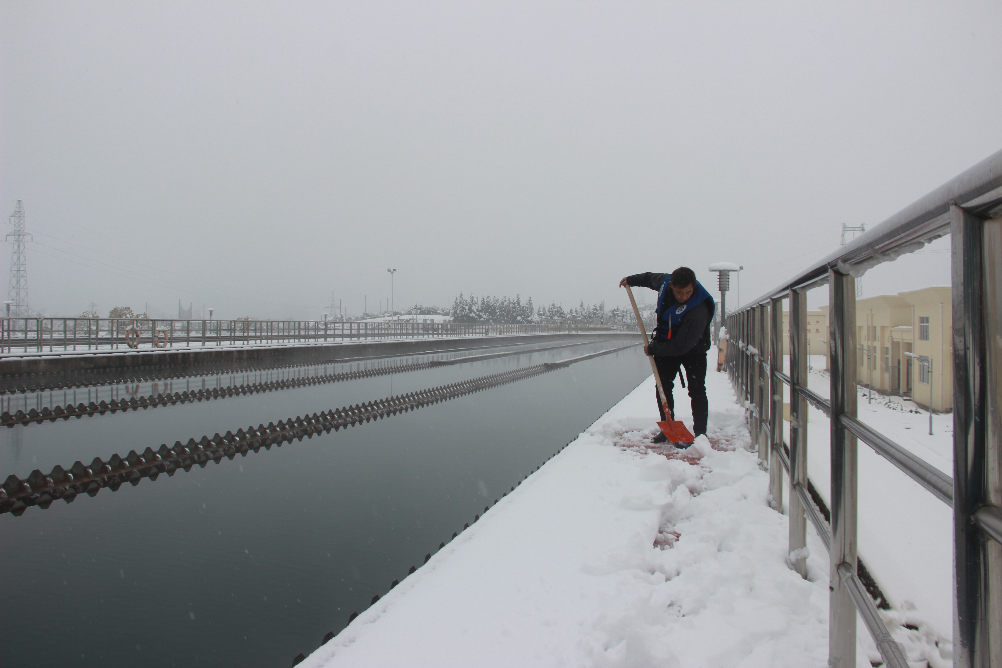 圖:平流沉淀池清雪 公司調(diào)度中心密切監(jiān)測供水管網(wǎng)壓力,根據(jù)供水需求變化制定調(diào)度方案,合理調(diào)控管網(wǎng)壓力,防止爆管事故。 公司客服部在微信公眾號、公司官網(wǎng)等公眾平臺發(fā)布供水防凍通知,提醒市民做好用水設(shè)施的防凍保暖工作。同時,實行24小時在崗值班制度,保障供水服務(wù)熱線全天接聽無阻,實時匯報事故信息。管網(wǎng)部成立應(yīng)急搶修專班,提前籌備好事故搶修備件和搶修專用車等應(yīng)急物資,實行搶修專班24小時待崗制度,隨時待命,接到險情將第一時間趕赴現(xiàn)場進行搶修。 在咸寧聯(lián)合水務(wù)營業(yè)廳門口,公司青年志愿者自告奮勇,對營業(yè)廳門口及周圍的積雪進行清掃,方便前來營業(yè)廳的群眾辦理供水業(yè)務(wù)。
