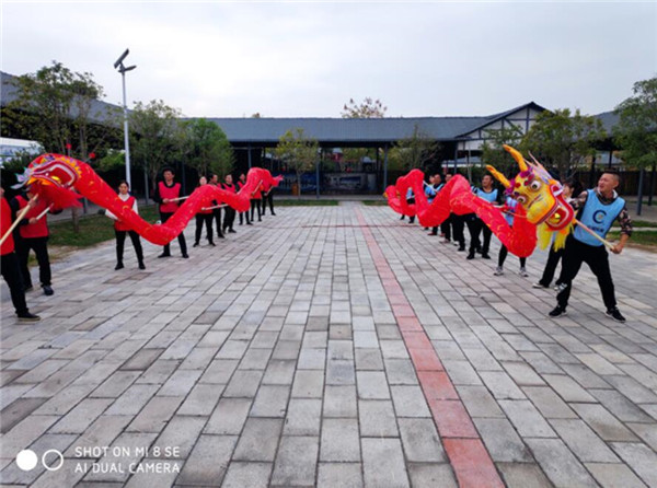 圖/ “鼓動人心”活動現場 最后一個項目是“龍騰盛世”。所有人齊心協力將零件組裝成一條活靈活現的龍,并在教練的指導下完成龍騰四海、盤龍云海及游龍戲水三個動作。這是一個大型創作類項目,趣味性和團隊合作性極強。大家各司其職,制作龍骨、畫龍鱗、粘龍頭龍尾,不到一刻鐘的時間,兩條游龍就制作完成。在舞龍環節,大家專心聽、用心舞,兩隊的舞龍動作都得到了教練的高度贊揚。最后,在教練“風水越來越順、生活越來越好”的祝福中結束了愉快而充實的團建拓展活動。