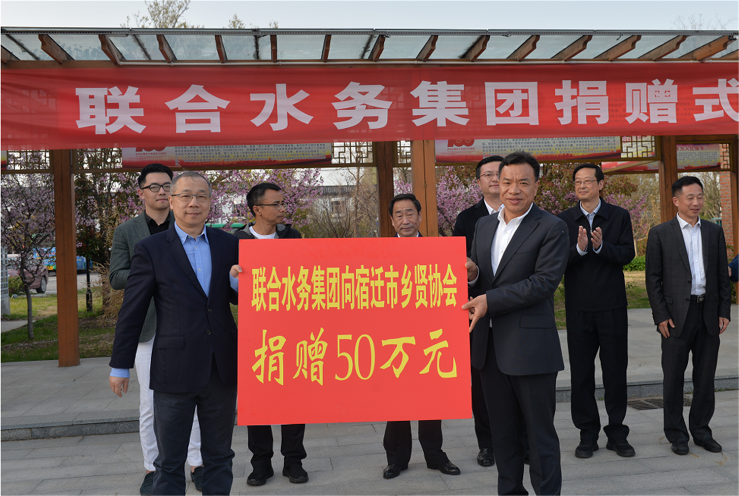 捐贈儀式現(xiàn)場合影 3月28日下午,聯(lián)合水務集團董事長兼總裁俞偉景一行來宿考察鄉(xiāng)賢義務護水工作,并向市鄉(xiāng)賢協(xié)會捐贈人民幣50萬元為護水鄉(xiāng)賢購買人身意外傷害保險。宿遷市政協(xié)副主席、黨組副書記,市鄉(xiāng)賢協(xié)會顧問華志明及市、區(qū)鄉(xiāng)賢協(xié)會負責人出席捐贈儀式,共同見證這一神圣的時刻。